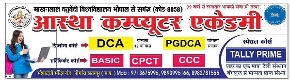आस्था कंप्यूटर अकादमी का परिचय आस्था कंप्यूटर अकादमी, नौगांव, छतरपुर में स्थित एक प्रमुख शैक्षणिक संस्थान है। यहाँ पर छात्रों को मौलिक कंप्यूटर ज्ञान से लेकर आधुनिक सॉफ़्टवेयर विकास जैसे पाठ्यक्रमों की शिक्षा प्रदान की Read more